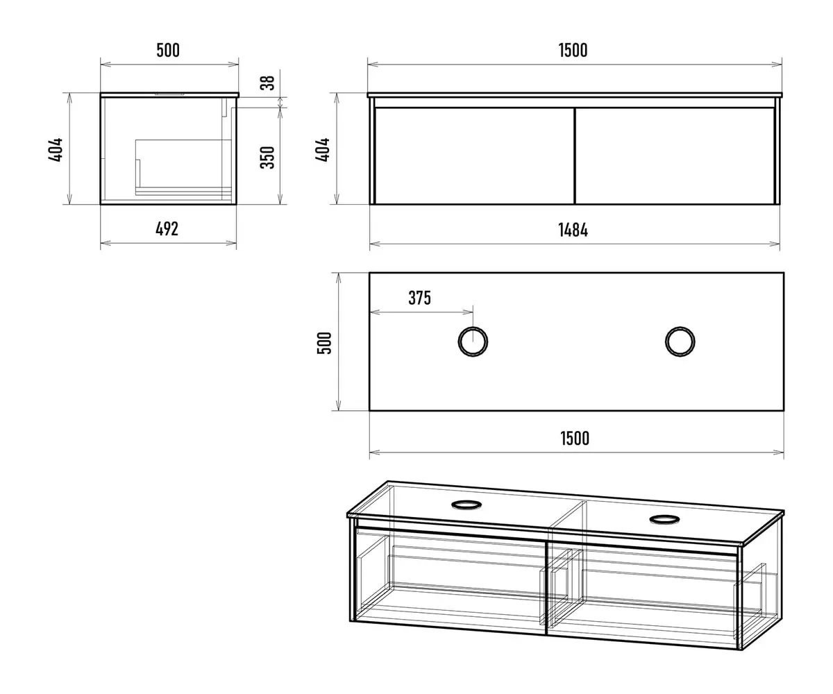 Габариты корпуса тумбы (ШхВхГ): 1484х388х492 мм.