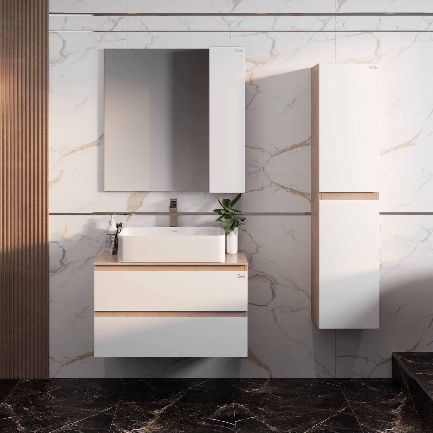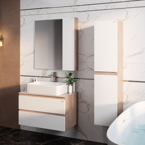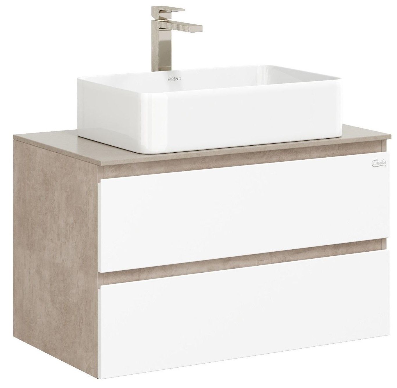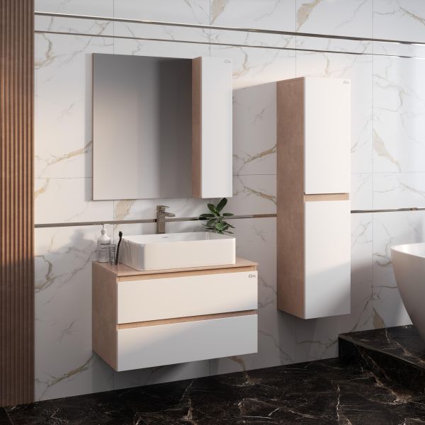 Подвесная тумба Onika Алеста 80 отражает актуальные тенденции в дизайне мебели для ванной комнаты: минимализм и геометрия фасадов, белый глянец и текстура бетонного камня, отсутствие декора, столешница из керамогранита и накладная раковина.