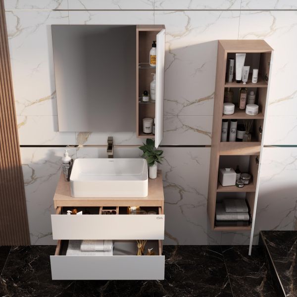 Два ящика с направляющими скрытого монтажа с доводчиками разделены на отсеки для удобной организации косметических средств и других аксессуаров.