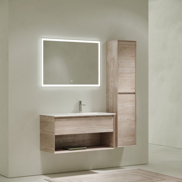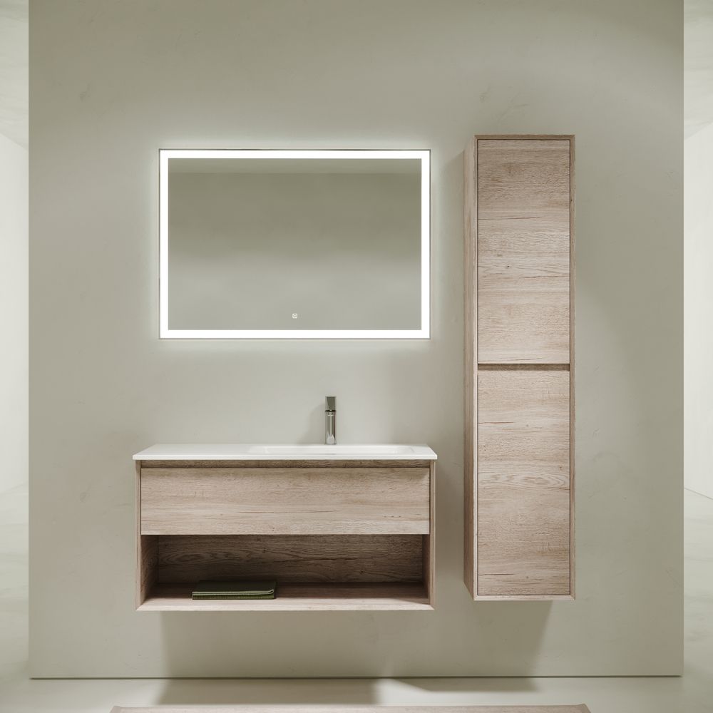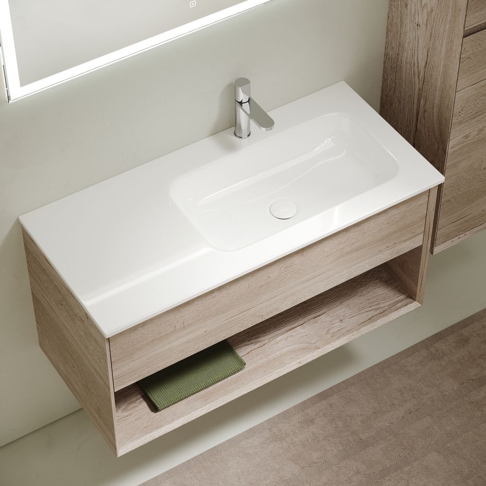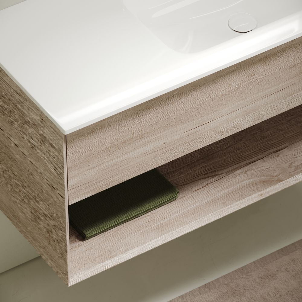 Тумба подвесная SANCOS Marmi 1.0 правая, 995х445х520, c одним ящиком оснащенным доводчиками скрытого монтажа с системой Soft close (плавного закрывания) и открытой нишей, c фрезерованной ручкой по всей длине фасада, дуб галифакс натуральный, арт. MR1.0100REG