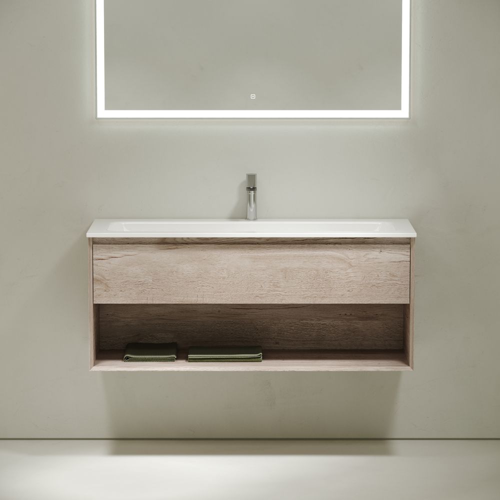 Тумба подвесная SANCOS Marmi 1.0 1195х445х520 c одним ящиком оснащенным доводчиками скрытого монтажа с системой Soft close (плавного закрывания) и открытой нишей, c фрезерованной ручкой по всей длине фасада, дуб галифакс натуральный, арт. MR1.0120EG