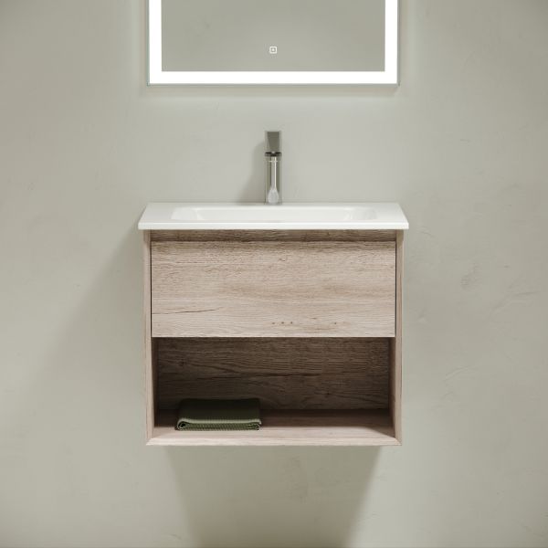 Тумба подвесная SANCOS Marmi 1.0 590х445х520 c одним ящиком оснащенным доводчиками скрытого монтажа с системой Soft close (плавного закрывания) и открытой нишей, c фрезерованной ручкой по всей длине фасада, дуб галифакс натуральный, арт. MR1.060EG