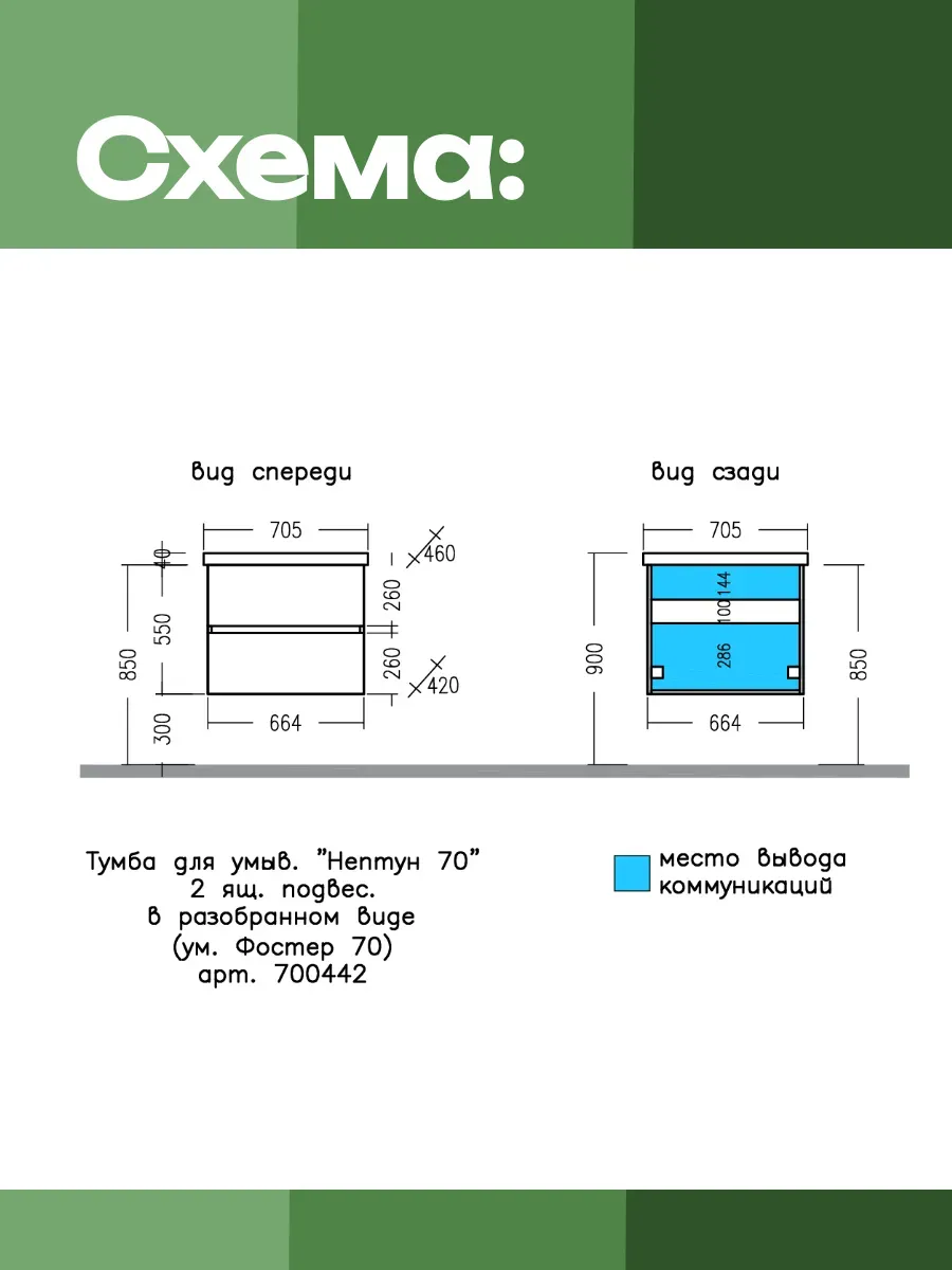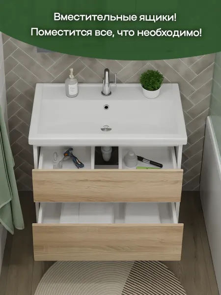 Современная и практичная подвесная тумба «Нептун 70» — идеальное решение для обустройства стильной и функциональной ванной комнаты. Выполненная в оттенке «янтарный дуб» с белыми боковыми панелями, тумба легко впишется в любой интерьер. Подходит для установки с умывальником «Фостер 70» Раковина идет в комплекте! Преимущества: Влагостойкий материал — сертифицированная мебель специально для ванных комнат. Поставляется в разобранном виде — удобна для транспортировки и самостоятельной сборки. Два вместительных выдвижных ящика — всё необходимое всегда под рукой. Продуманная конструкция — предусмотрено место для вывода коммуникаций. Габариты тумбы: Ширина: 664 мм Высота: 550 мм Глубина: 420 мм Материал корпуса: ЛДСП Материал фасада: МДФ с покрытием под натуральное дерево Крепление: Настенное (подвесное)