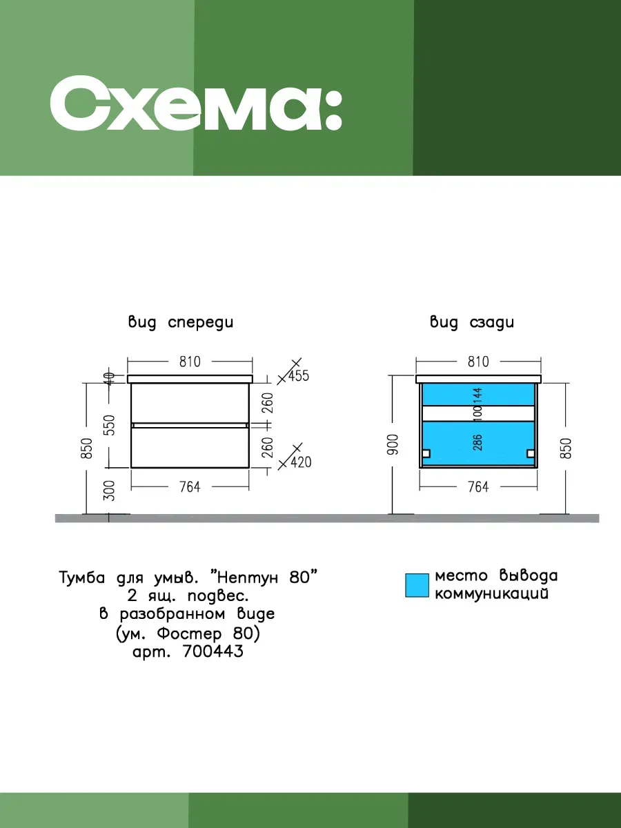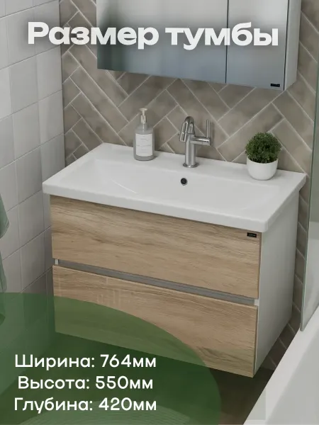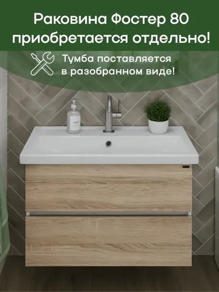 Современная и практичная подвесная тумба «Нептун 80» — идеальное решение для обустройства стильной и функциональной ванной комнаты. Выполненная в оттенке «янтарный дуб» с белыми боковыми панелями, тумба легко впишется в любой интерьер. Подходит для установки с умывальником «Фостер 80» (приобретается отдельно). Преимущества: Влагостойкий материал — сертифицированная мебель специально для ванных комнат. Поставляется в разобранном виде — удобна для транспортировки и самостоятельной сборки. Два вместительных выдвижных ящика — всё необходимое всегда под рукой. Совместимость с умывальником Фостер 80 — идеально подходит по размерам и стилю. Продуманная конструкция — предусмотрено место для вывода коммуникаций. Габариты тумбы: Ширина: 764 мм Высота: 550 мм Глубина: 420 мм Материал корпуса: ЛДСП Материал фасада: МДФ с покрытием под натуральное дерево Крепление: Настенное (подвесное)