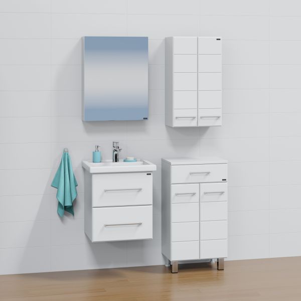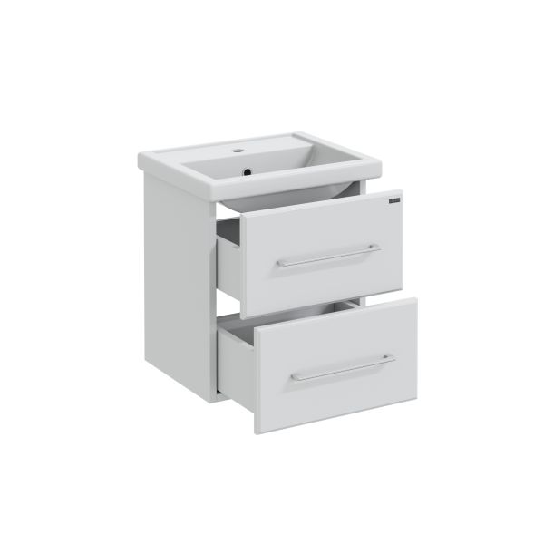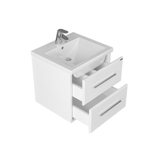 Тумба подвесная Омега 50 для умывальника Фостер 50. Корпус изделия выполнен из влагостойкого ЛДСП, фасад из МДФ и покрыт пленкой. Выдвижные ящики тумбы оснащены шариковыми направляющими полного выдвижения.