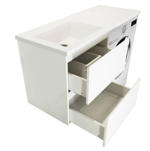Коллекция мебели для ванной комнаты Dallas Luxe покоряет своей удивительной простой и функциональностью. Стильная лаконичная тумба, укомплектована раковиной из литьевого мрамора с удобной чашей. Стиральная машина устанавливается под столешницей, за счет чего экономит место в ванной комнате. В тумбе имеются два ящика. Нижн