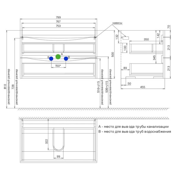 Подвесная конструкция тумбы делает ее воздушной и упрощает процесс уборки в ванной.