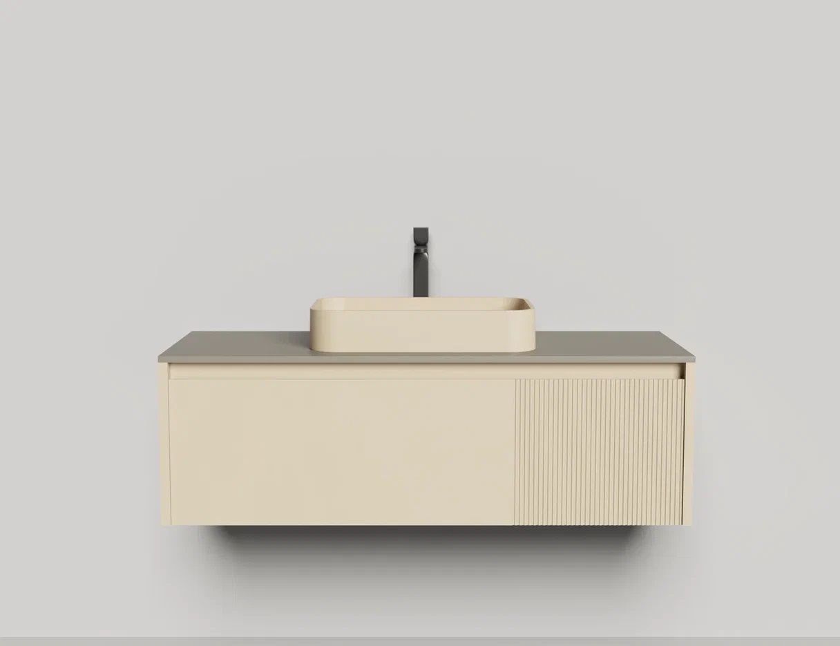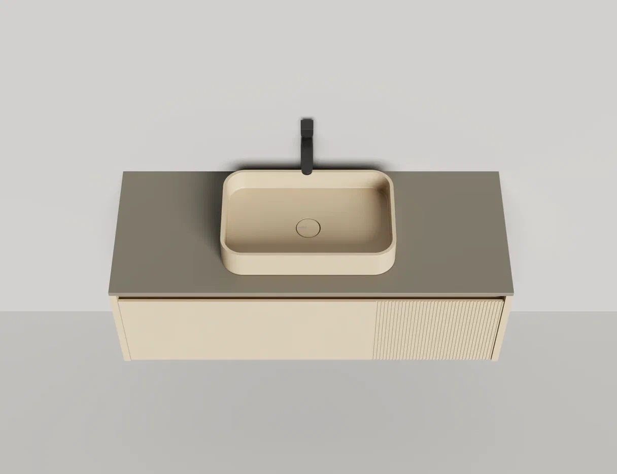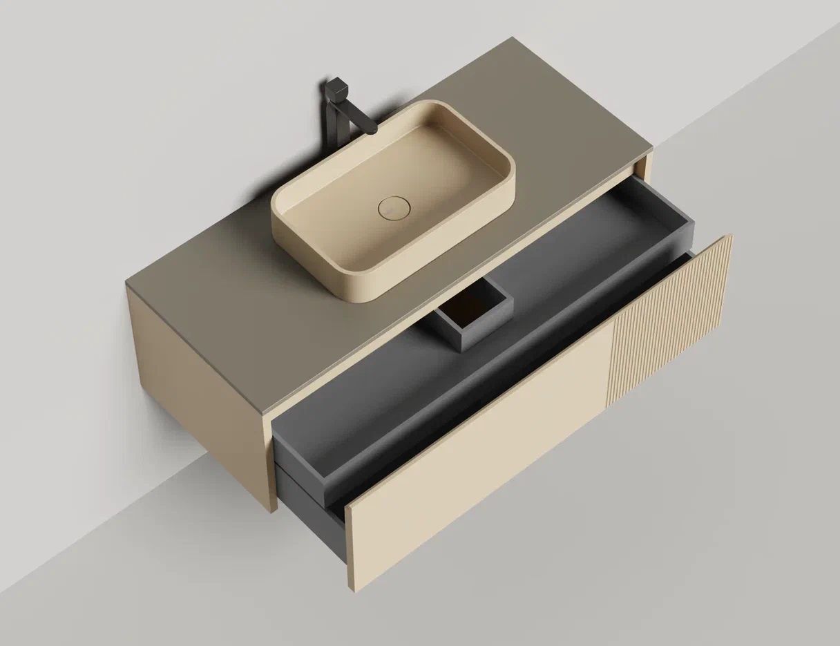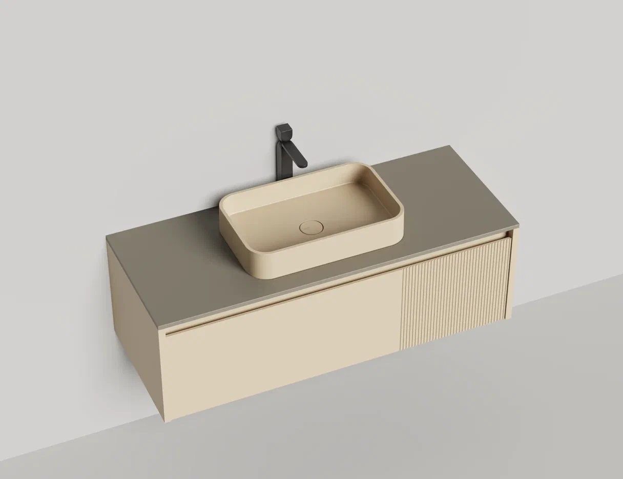 - Тумба и столешница из материала S-Stone в сборе (накладные раковины укомплектованы донным клапаном и поставляются в отдельной коробке)