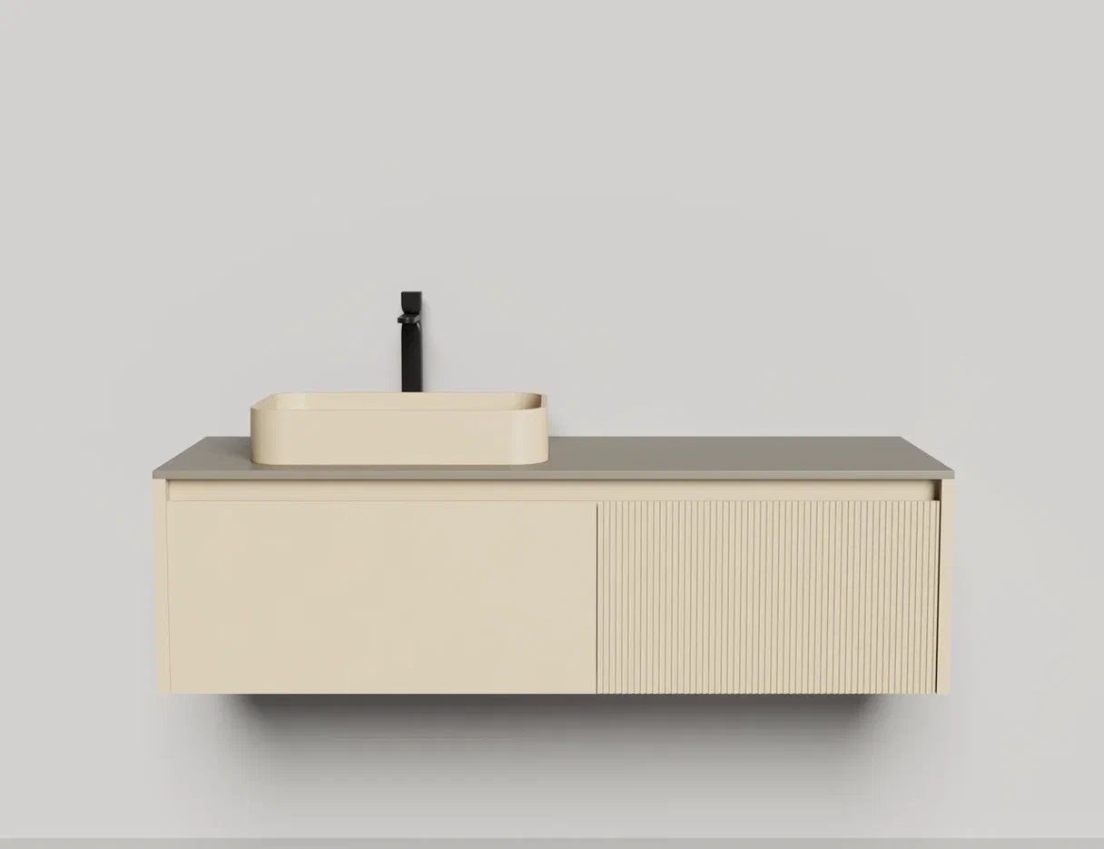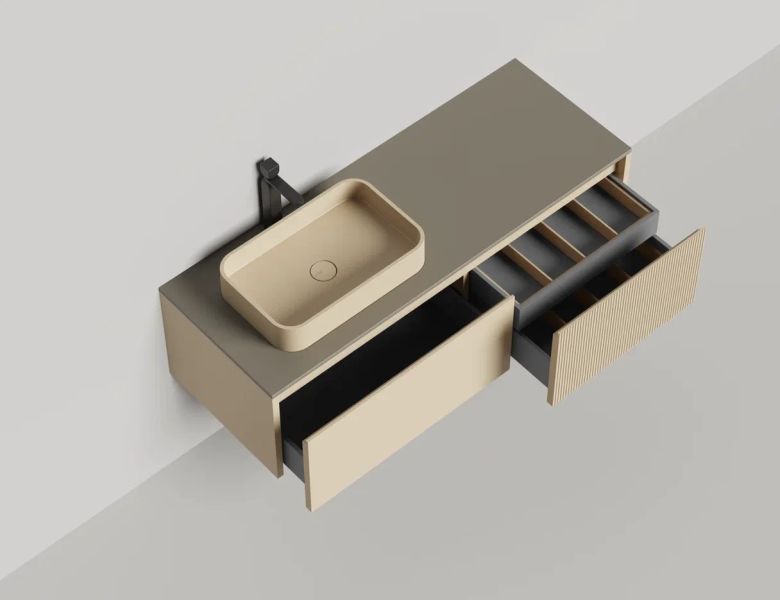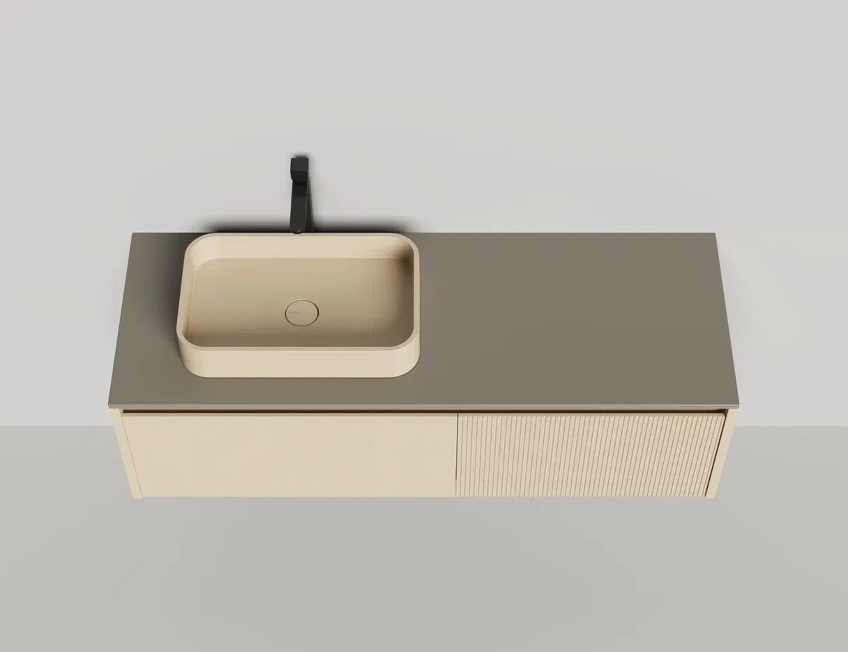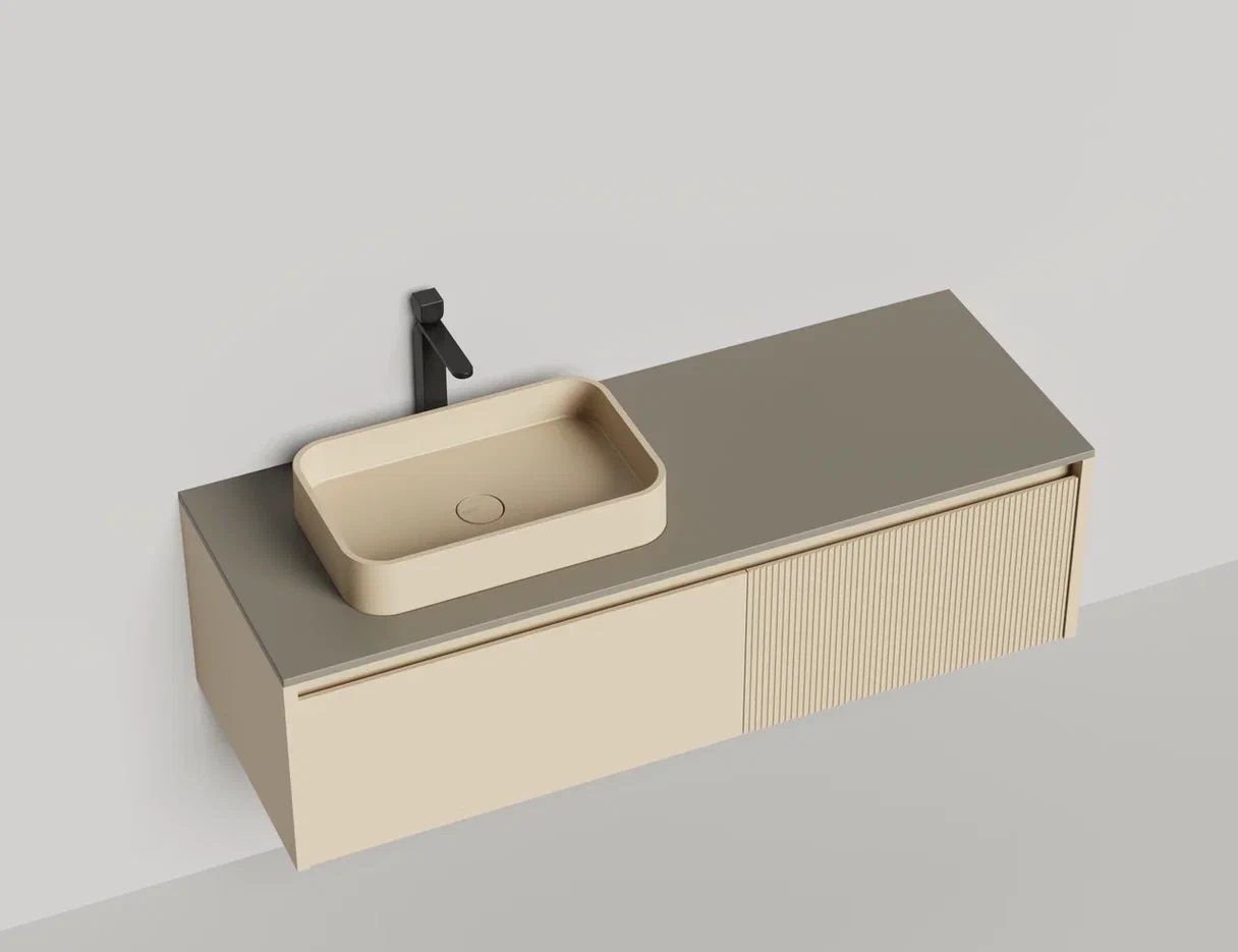 - Тумба и столешница из материала S-Stone в сборе (накладные раковины укомплектованы донным клапаном и поставляются в отдельной коробке)