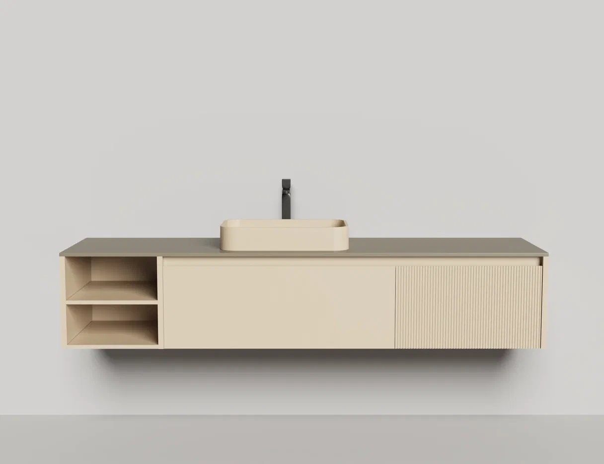 - Тумба и столешница из материала S-Stone в сборе (накладные раковины укомплектованы донным клапаном и поставляются в отдельной коробке)