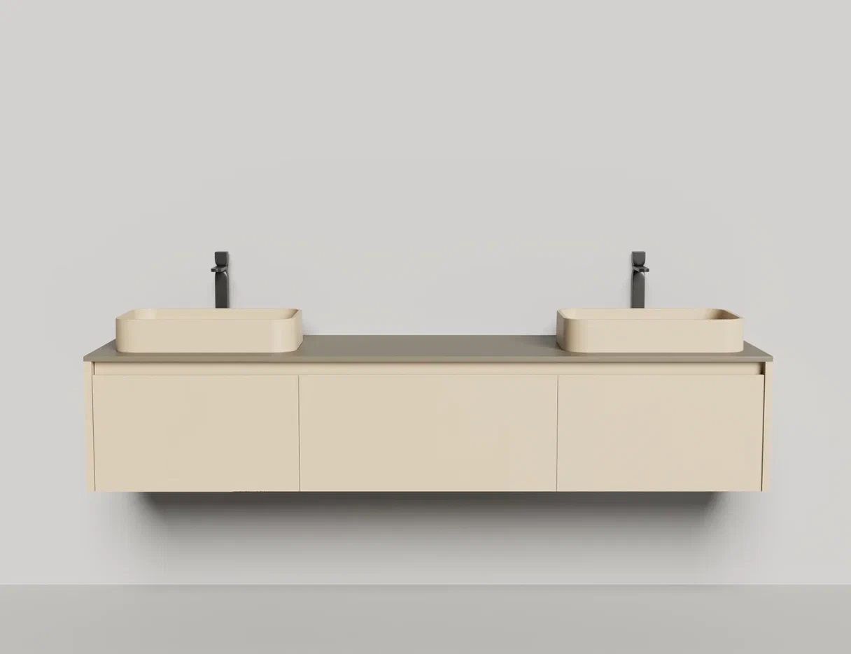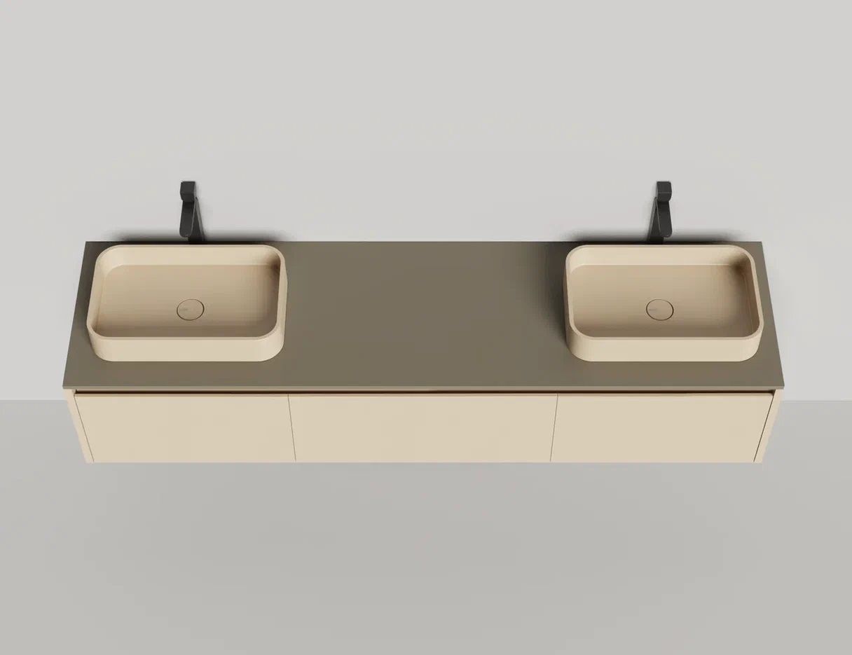 - Тумба и столешница из материала S-Stone в сборе (накладные раковины укомплектованы донным клапаном и поставляются в отдельной коробке)
