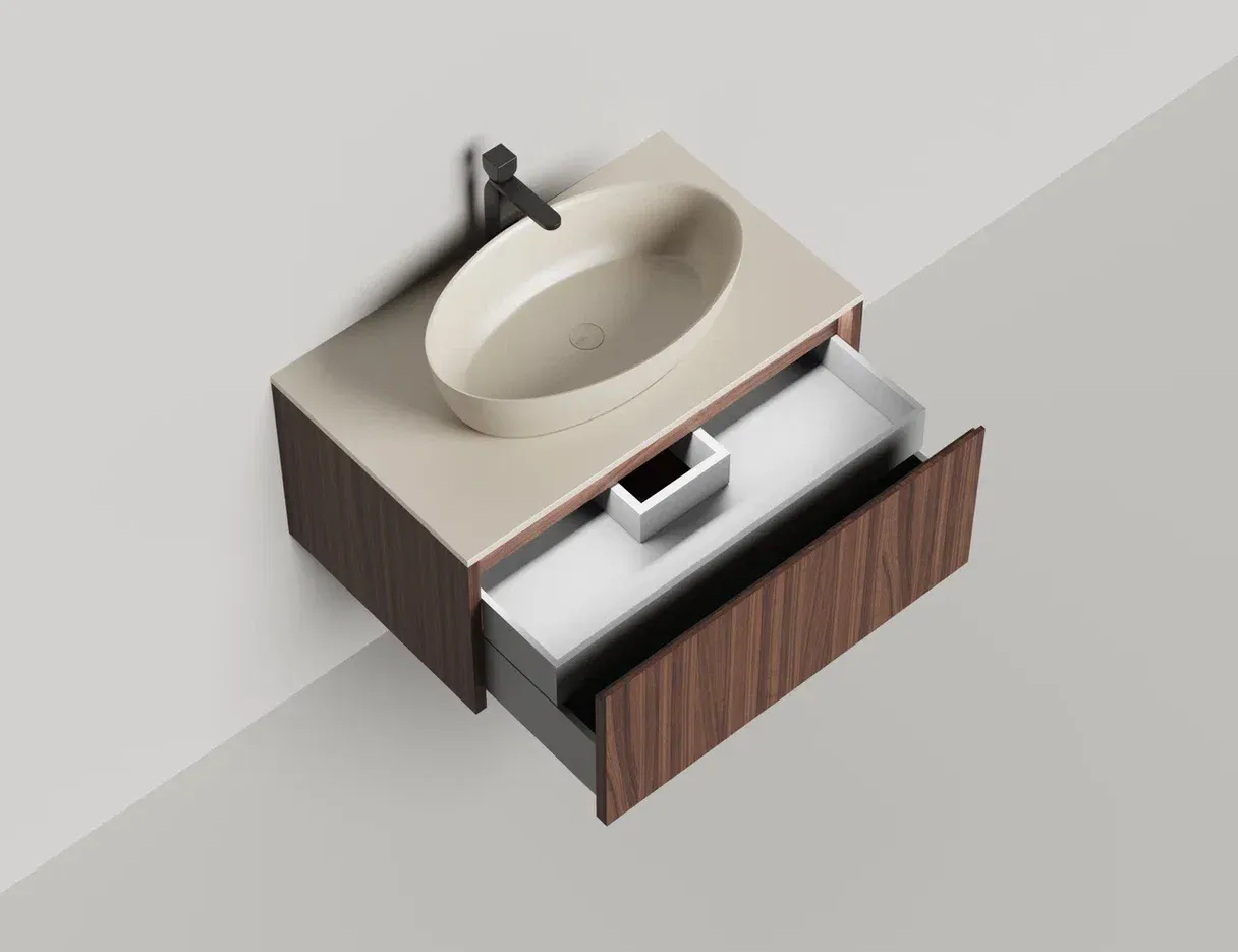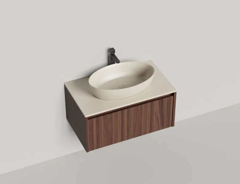 - Тумба и столешница из материала S-Stone в сборе (накладные раковины укомплектованы донным клапаном и поставляются в отдельной коробке)