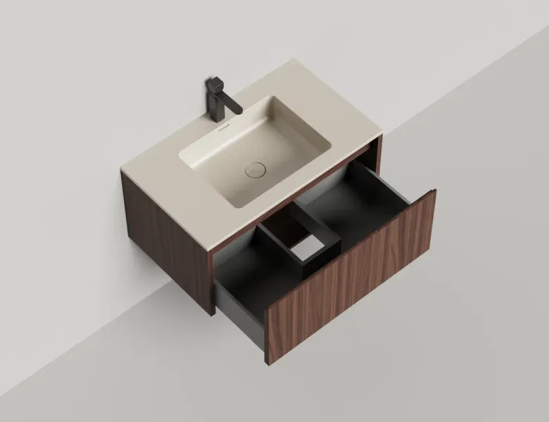 Подвесная тумба DOMINO предназначена для установки со встроенными или накладными раковинами Salini. Она отличается современным дизайном и привлекательным внешним видом. Гладкие и рельефные фасады ящиков в шпоне дерева или в матовом лаке позволяют подобрать комбинацию подходящего размера (ширина от 80 до 200 см) и наполнения.