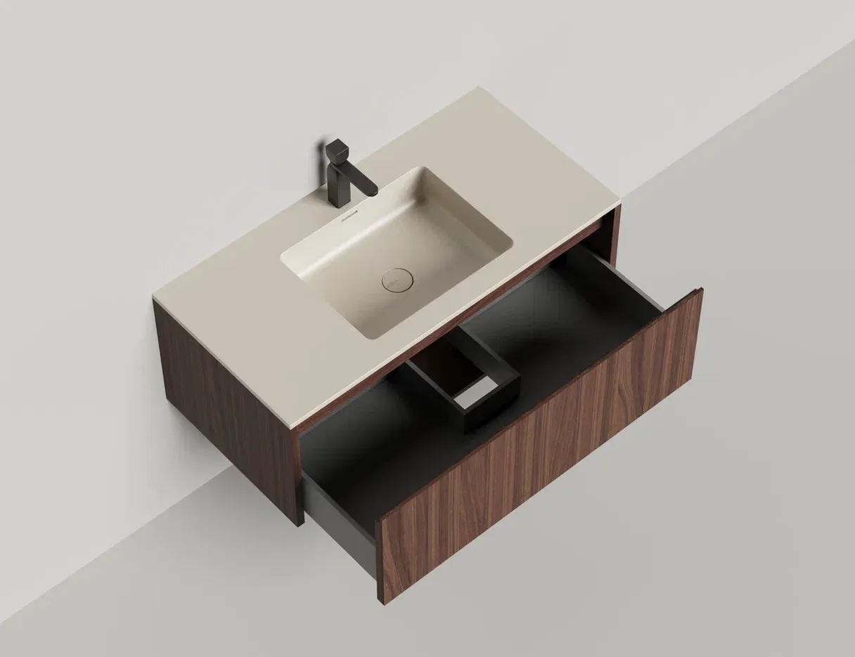 - Тумба и столешница из материала S-Stone в сборе (накладные раковины укомплектованы донным клапаном и поставляются в отдельной коробке)