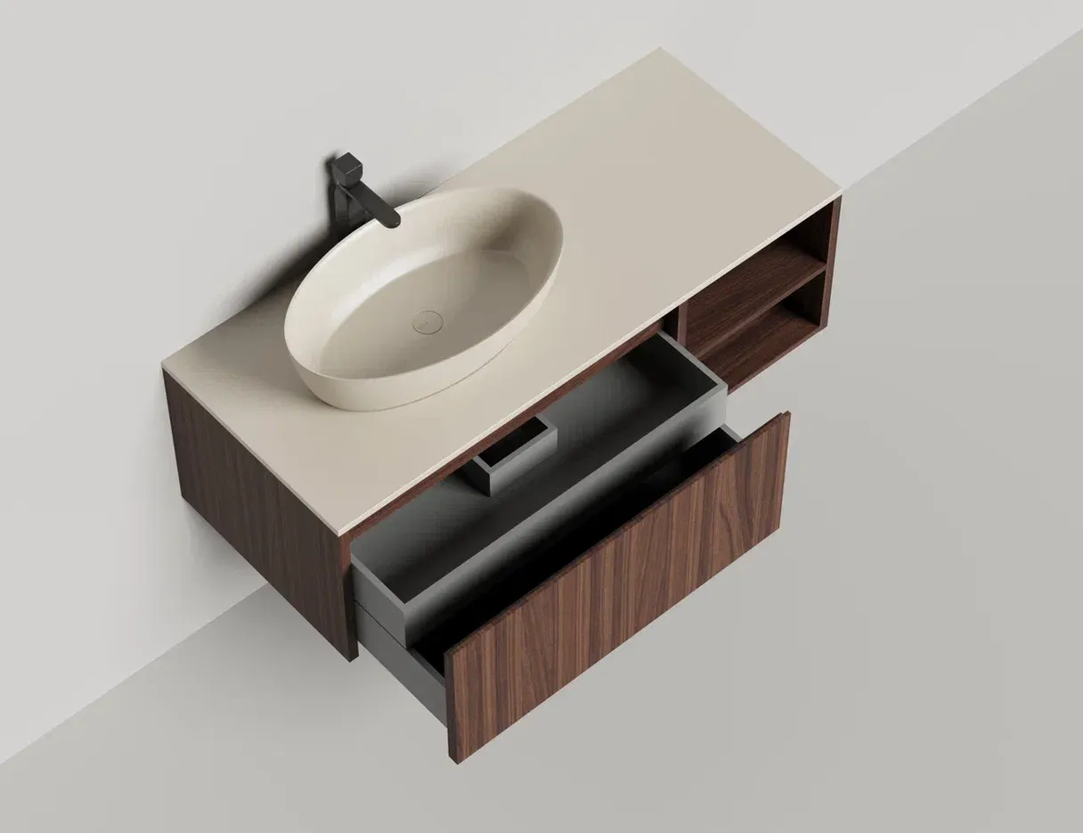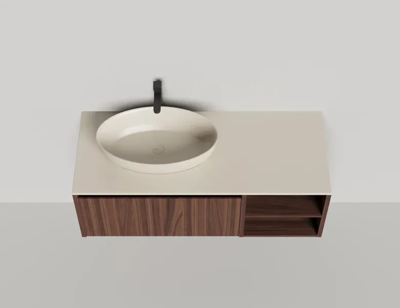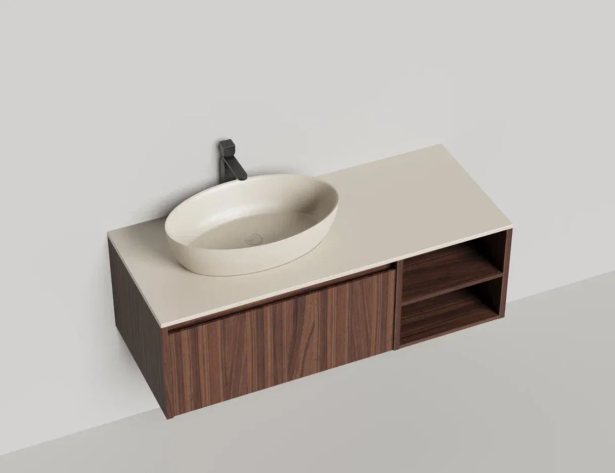 - Тумба и столешница из материала S-Stone в сборе (накладные раковины укомплектованы донным клапаном и поставляются в отдельной коробке)