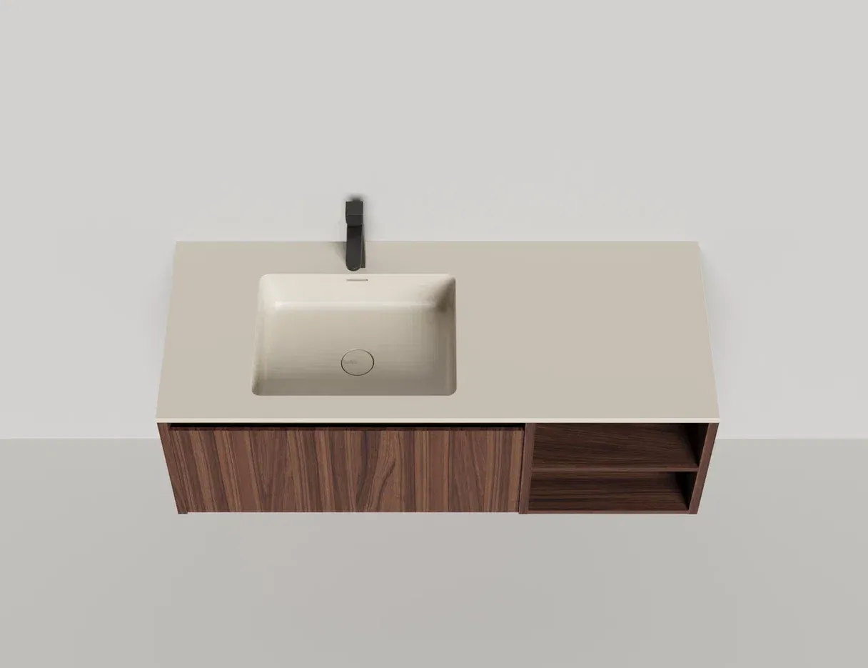 - Тумба и столешница из материала S-Stone в сборе (накладные раковины укомплектованы донным клапаном и поставляются в отдельной коробке)