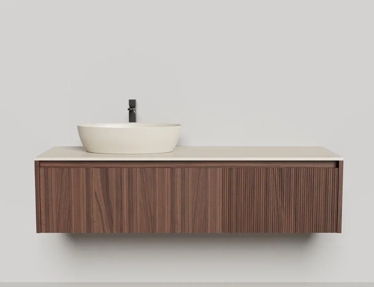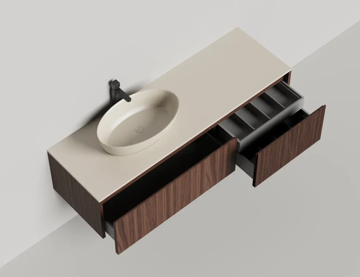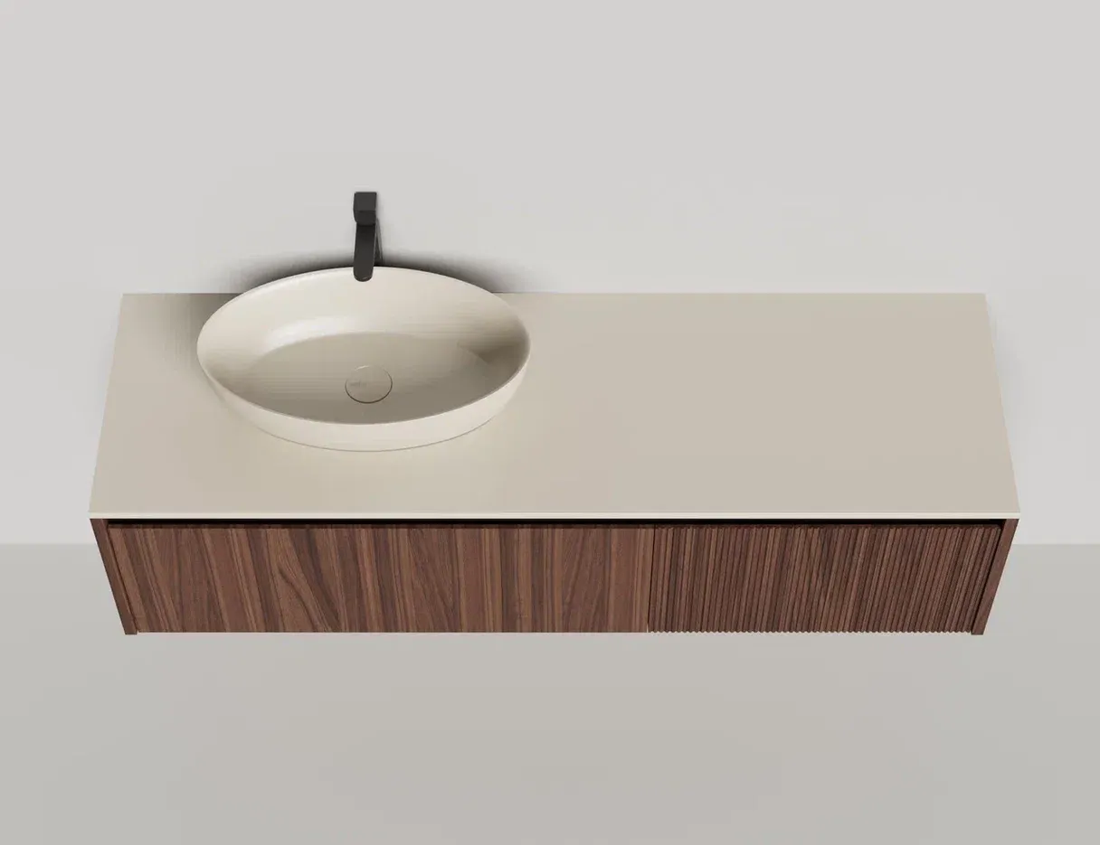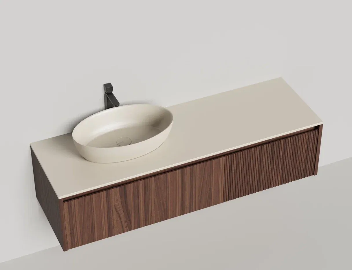 - Тумба и столешница из материала S-Stone в сборе (накладные раковины укомплектованы донным клапаном и поставляются в отдельной коробке)