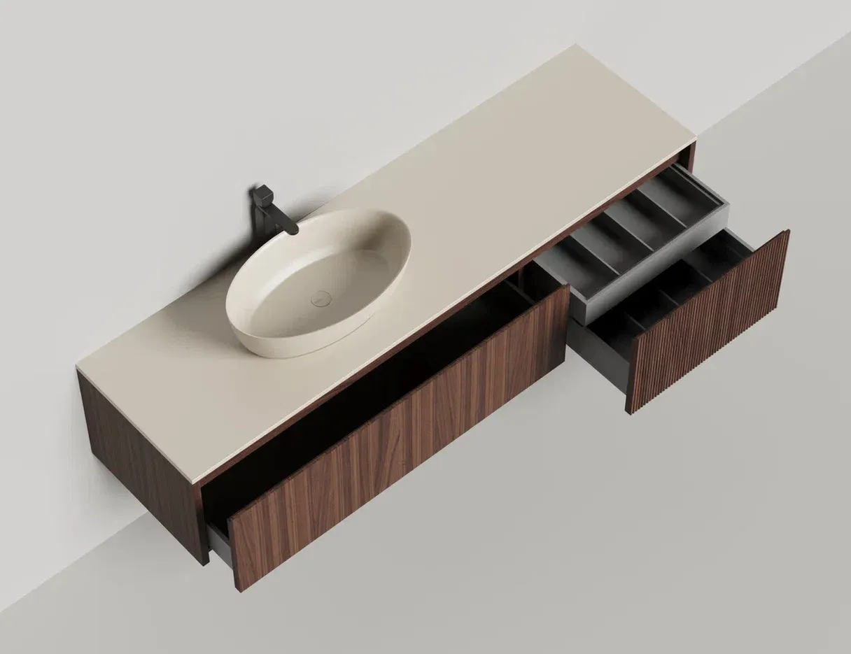 Наполнение для тумбы включает: блоки ячеек для тумб, коврики и комплект внутренней подсветки, которые помогут организовать пространство и создать более удобный доступ к вещам.Тумба DOMINO, дополненная столешницей COSTA из каменного литья S-Stone, гарантирует практичность и простоту ухода.