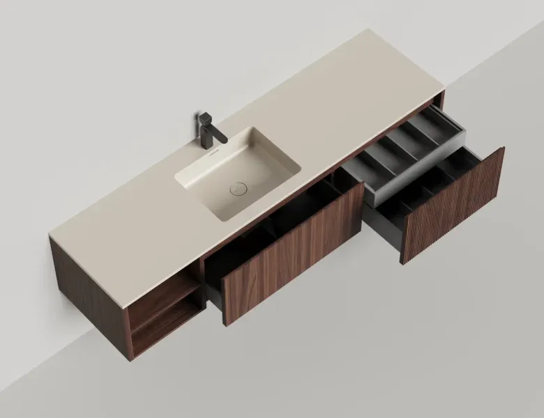 Наполнение для тумбы включает: блоки ячеек для тумб, коврики и комплект внутренней подсветки, которые помогут организовать пространство и создать более удобный доступ к вещам.Тумба DOMINO, дополненная столешницей COSTA из каменного литья S-Stone, гарантирует практичность и простоту ухода.
