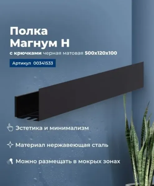 Полка Aquanet Магнум Н 50x12 черная матовая, с крючками — это компактное и стильное решение для организации пространства, которое сочетает в себе функциональность и современный дизайн. Вот ее основные характеристики и преимущества: