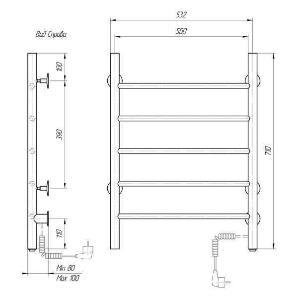 Комплект поставки: полотенцесушитель с ТЭНом в сборе, комплект креплений, комплект для скрытого подключения, шнур электропитания с вилкой, инструкция.