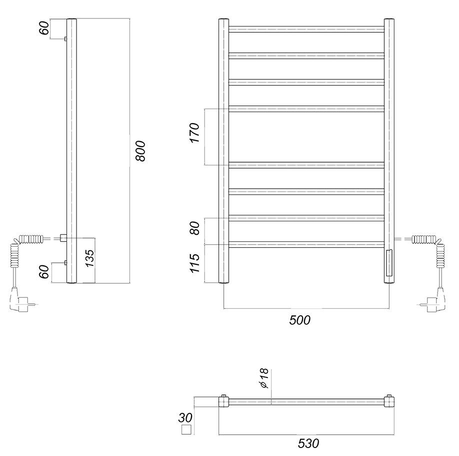 Количество перекладин: 8Коллекция: КубаТип: электрическиеЦвет: хромМощность, Вт: 110Ширина (мм): 500Высота (мм): 800Глубина (мм): 100Вес: 5,4Объем: 0,04Тэн/подключение: справаСтрана: РоссияГарантия: 2 года