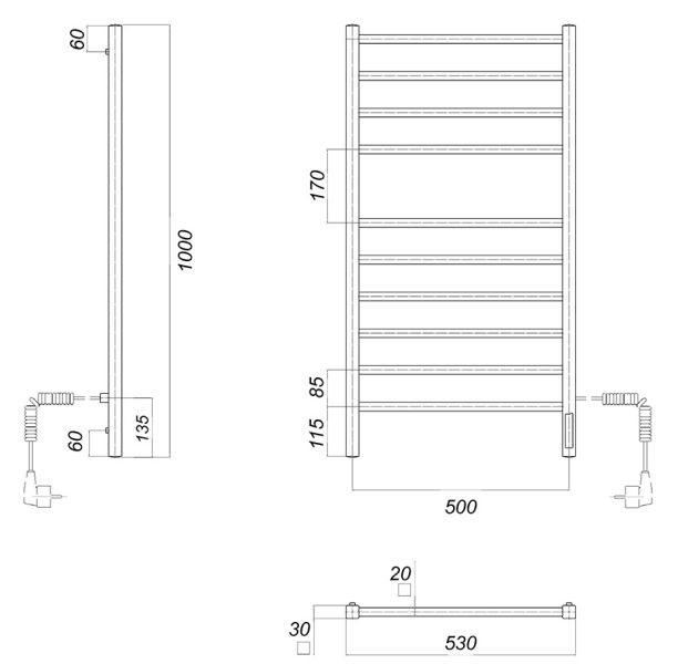 Количество перекладин: 10Коллекция: КвадроТип: электрическиеЦвет: хромМощность, Вт: 113Ширина (мм): 500Высота (мм): 1000Глубина (мм): 100Вес: 6,3Объем: 0,075Тэн/подключение: справаСтрана: РоссияГарантия: 2 года