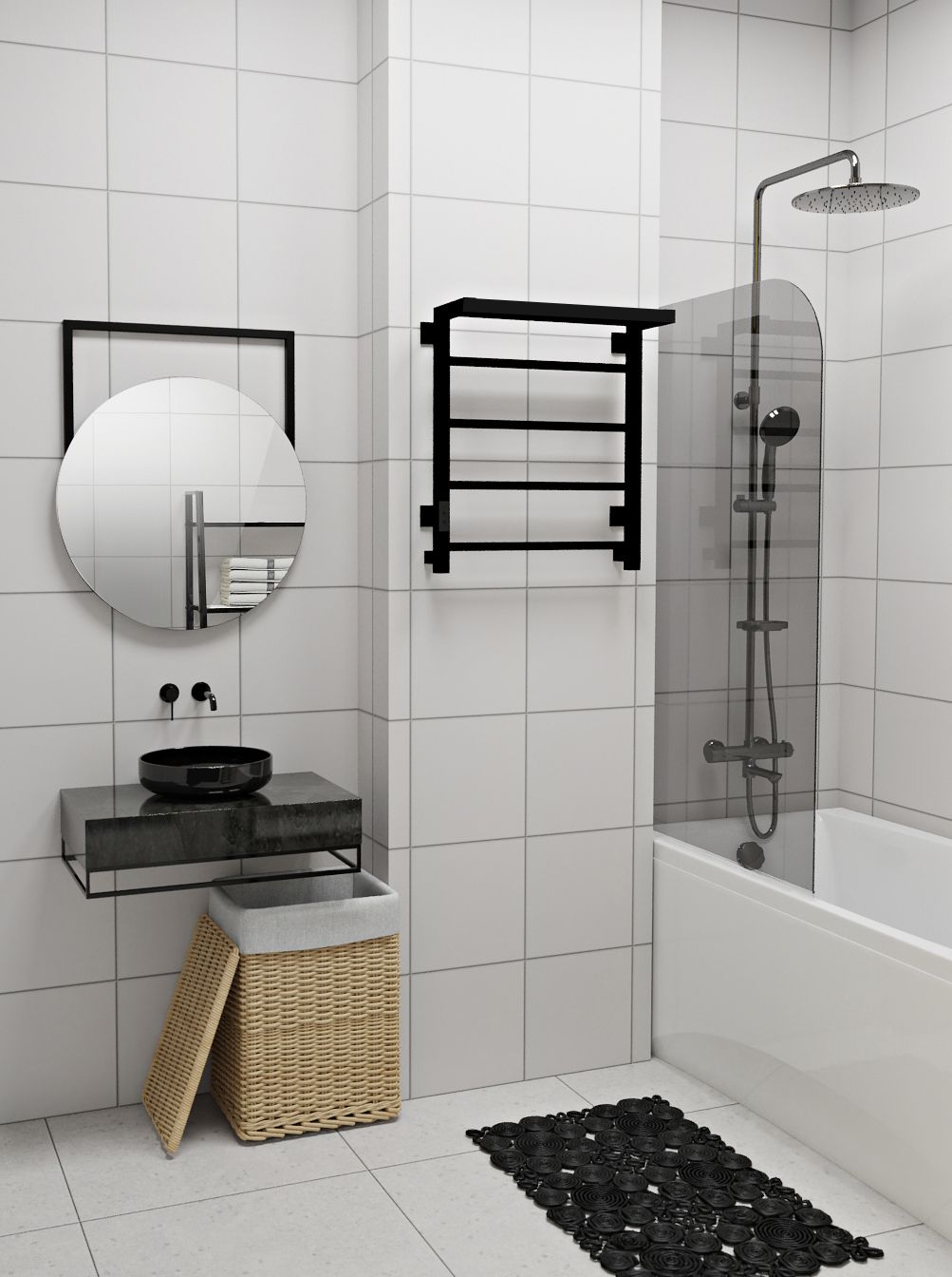 Полотенцесушитель с полкой удобен в использовании, благодаря полочке позволяет дополнительно хранить на нем текстильные изделия. Изделие окрашено порошковой краской по специальной технологии.
