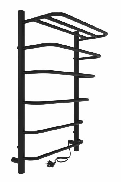 Электрический полотенцесушитель Hit в оттенке «Черный Муар». Оснащен дополнительно полкой, что удобно для дополнительной просушки или хранения текстильных вещей. Полотенцесушитель лесенка удобен в использовании, на нижней части стойки расположена кнопка включения.