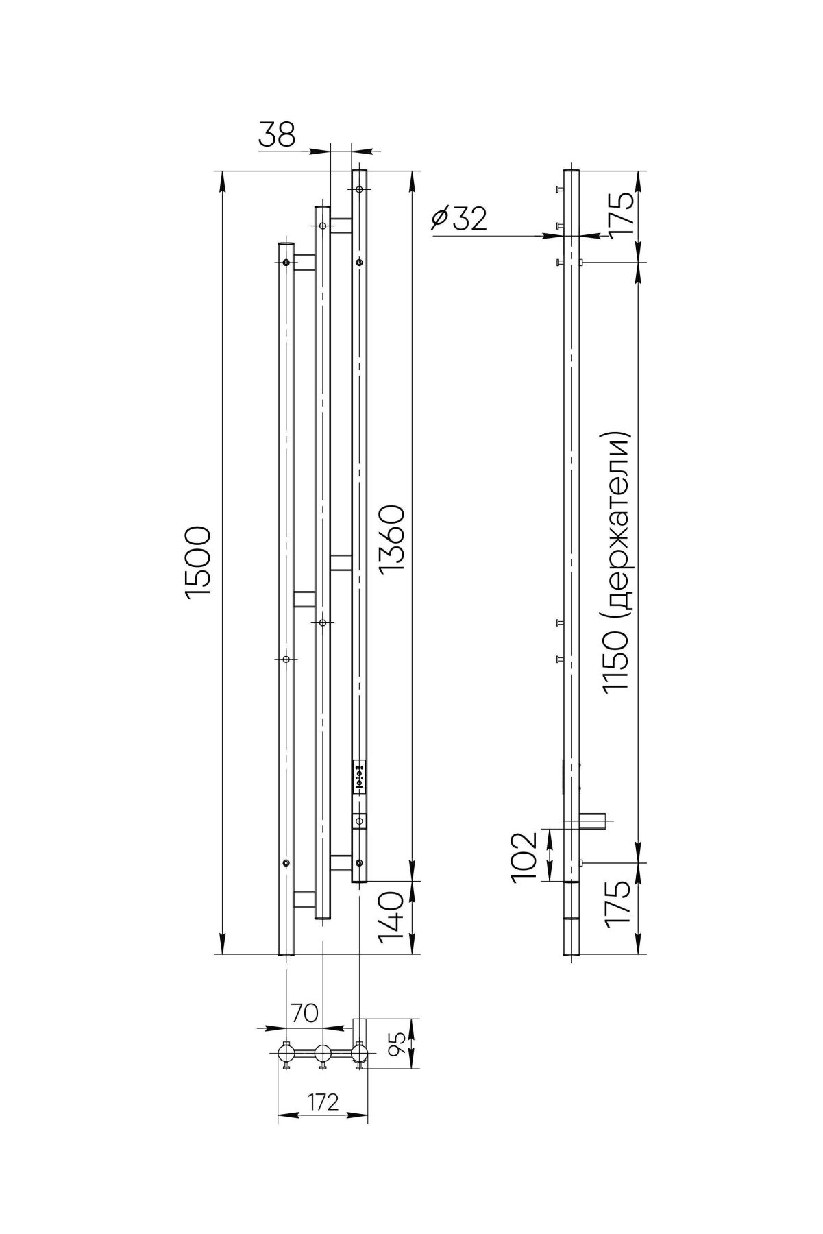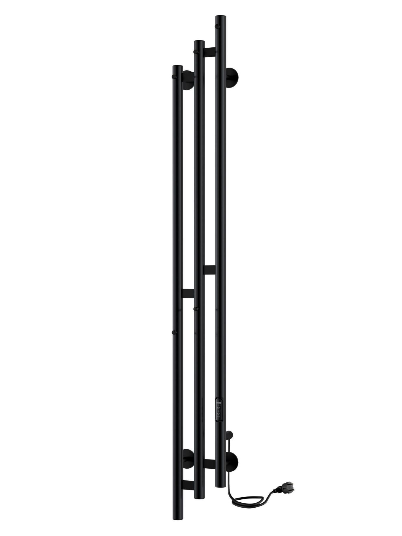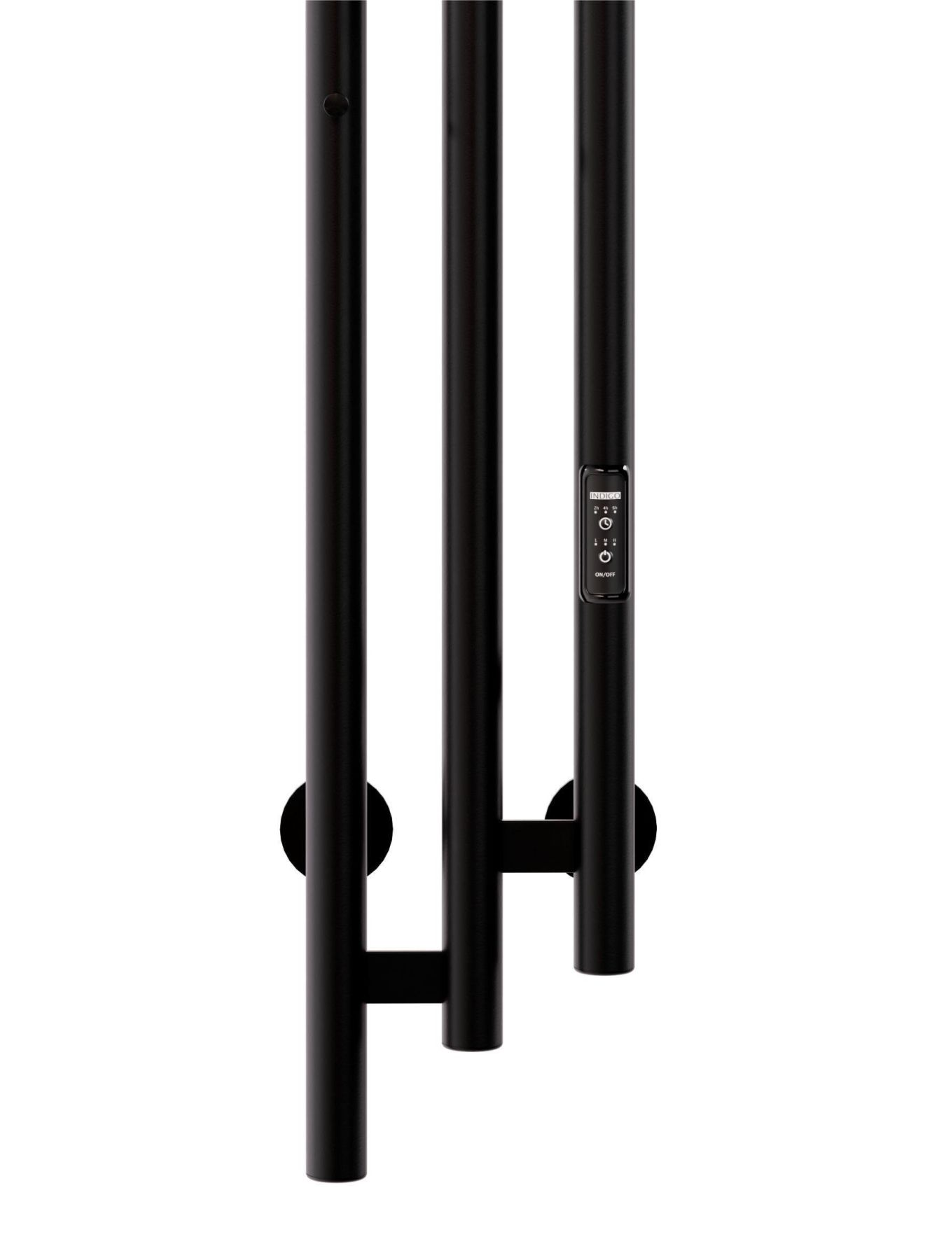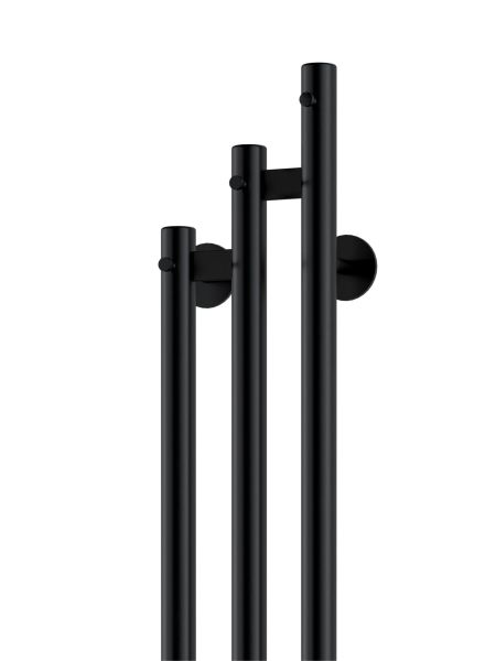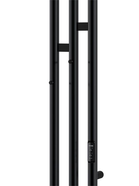 Электрический полотенцесушитель INDIGO Sky в цвете «Черный Муар». Уникальный дизайн, состоящий из трех круглых вертикальных стоек диаметром 32 мм, асимметрично соединенных прямоугольными перекладинами, придаст вашей ванной комнате современный вид. Полотенцесушитель черный матовый покрыт безопасным порошковым полимером, что делает его устойчивым к повреждениям и облегчает уход за ним.