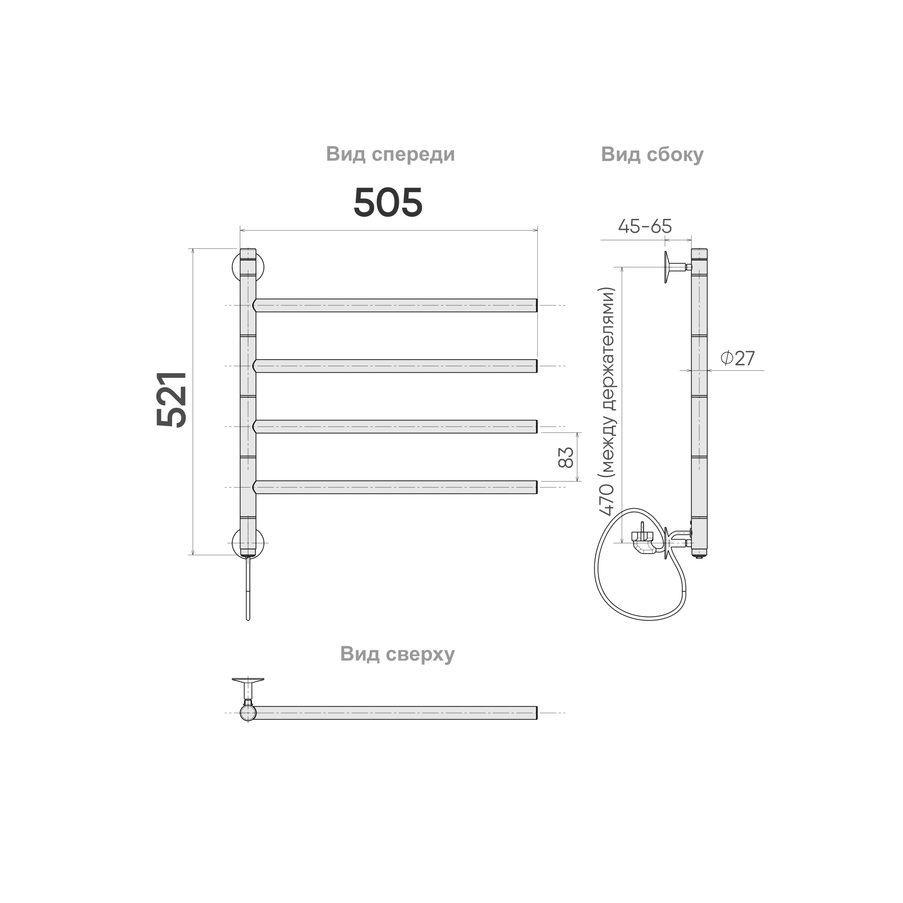 Полотенцесушитель электрический INDIGO Strela с кнопкой включения в нижней части стойки. Подключение через прямой провод. Длина прямого провода 1,1 метра.