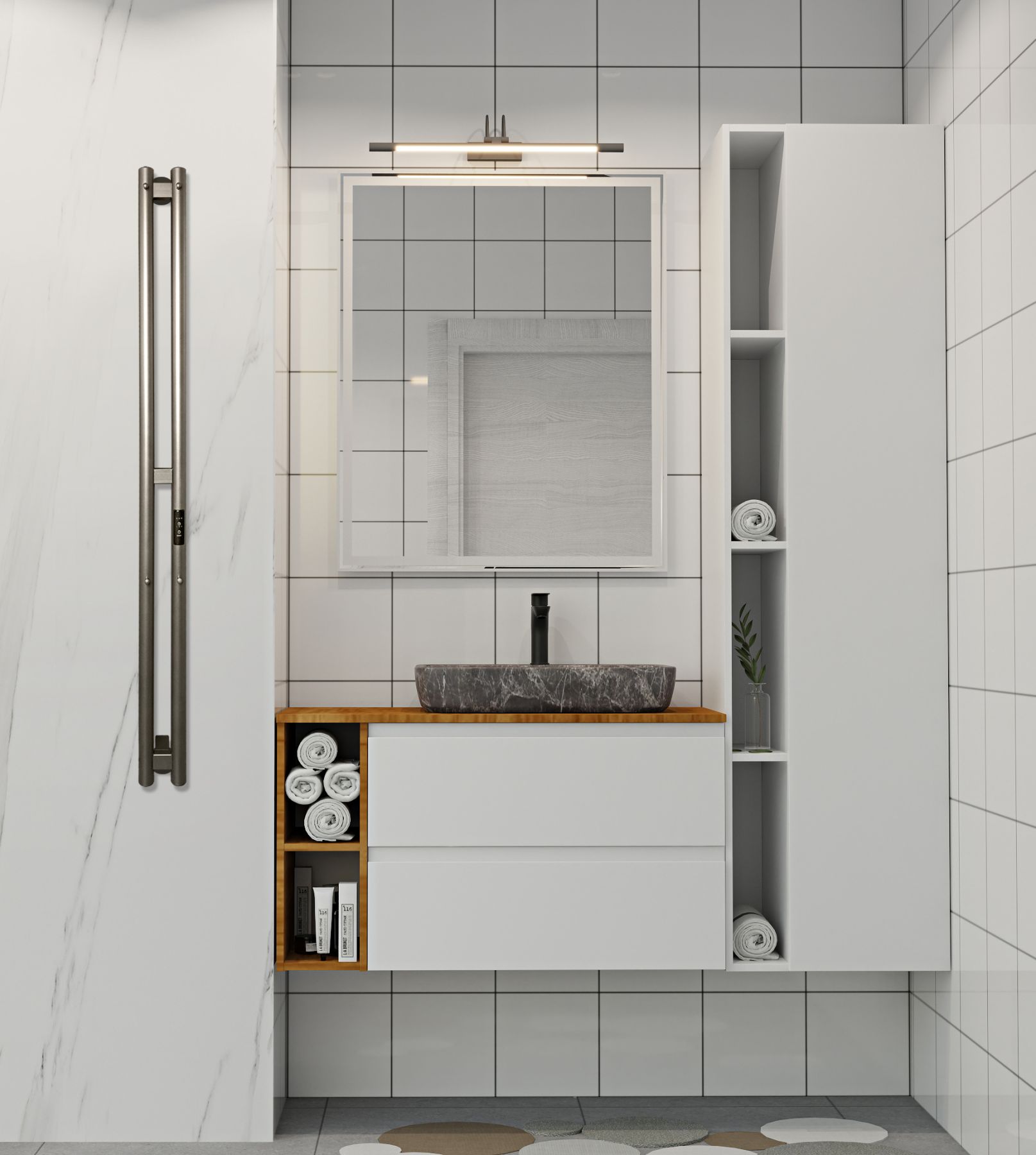 Выбирая данной полотенцесушитель рекомендуем выбирать скрытый монтаж, для более лаконичного дизайна ванной комнаты. Цвет полотенцесушителя подходит к светлым ванным комнатам, а также гармонично сочетается с интерьером, где присутствует бытовая техника белых оттенков.