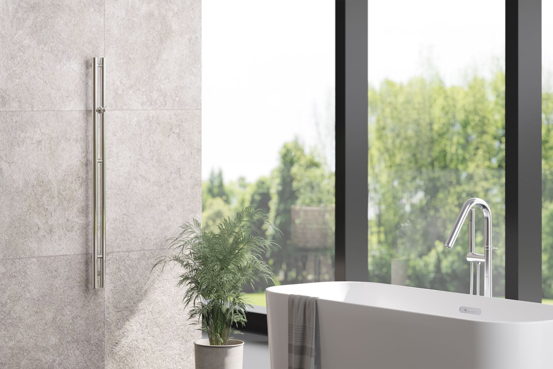 Полотенцесушитель имеет степень защиты IP54, что гарантирует безопасность использования в условиях повышенной влажности. Устройство поставляется со скрытым подключением и кабелем длиной 1,5 м, расположение блока управления и провода находится справа. Габариты прибора составляют 1200 мм в высоту и 85 мм в ширину, благодаря чему он хорошо впишется в пространство любой ванной комнаты.
