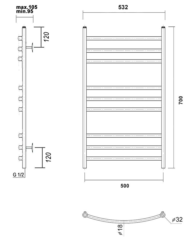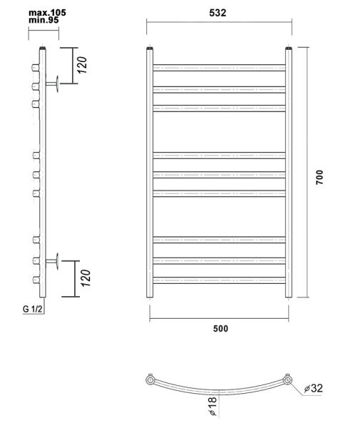 М/о расстояние (межосевое расстояние): 500Количество перекладин: 9Коллекция: КалипсоТип: водяныеЦвет: черныйШирина (мм): 532Высота (мм): 700Глубина (мм): 105-95Вес: 4,07Объем: 0,0619Тэн/подключение: нижнееСтрана: РоссияГарантия: 10 лет