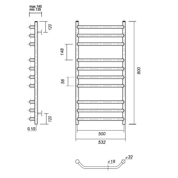 М/о расстояние (межосевое расстояние): 500Количество перекладин: 10Коллекция: ЛаураТип: водяныеЦвет: хромШирина (мм): 532Высота (мм): 800Глубина (мм): 145-135Вес: 5,94Объем: 0,070Страна: РоссияГарантия: 10 лет