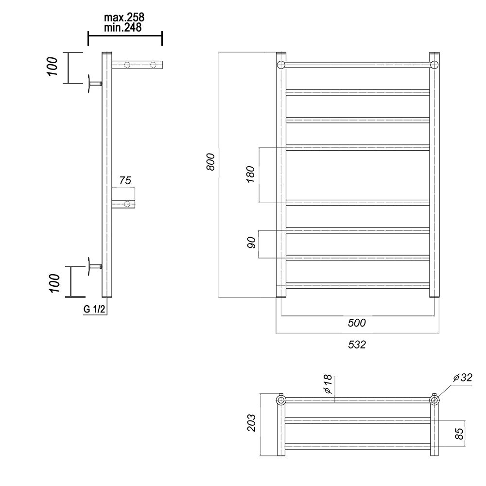 М/о расстояние (межосевое расстояние): 500Количество перекладин: 8Коллекция: Медея с полкойТип: водяныеЦвет: хромШирина (мм): 532Высота (мм): 800Глубина (мм): 258-248Вес: 6,2Объем: 0,1Страна: РоссияГарантия: 10 лет