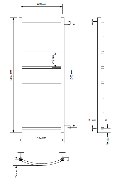Полотенцесушитель имеет дугообразные перекладины, что очень удобно при эксплуатации.