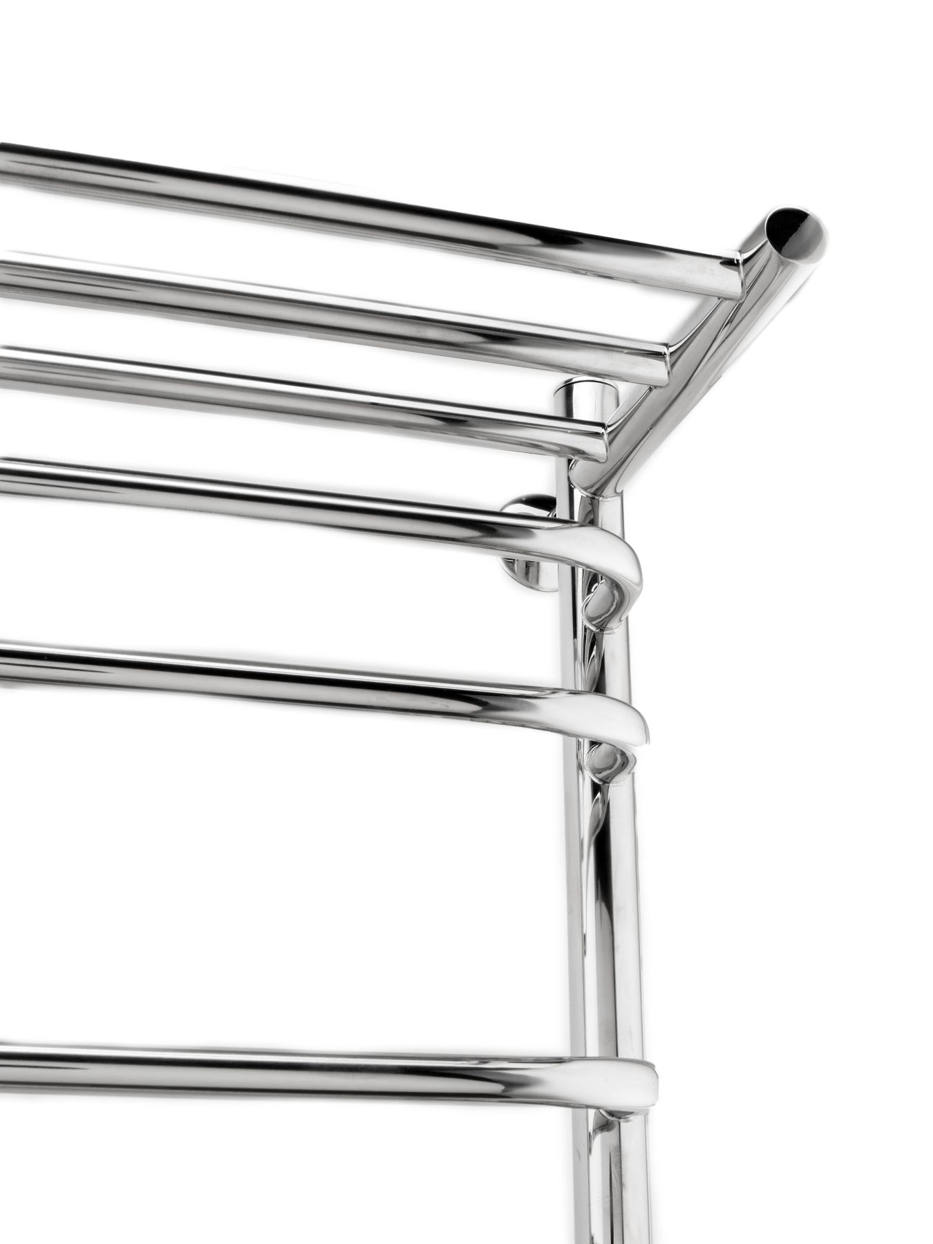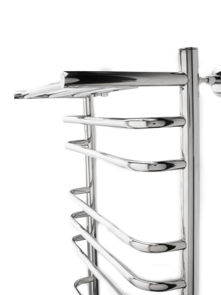 Тщательная полировка изделия придает ей великолепный оттенок «хром». Полотенцесушитель с полкой водяной удобен в использовании, на полочке можно хранить текстильные изделия для просушки, обеспечат круглосуточно теплые полотенца.