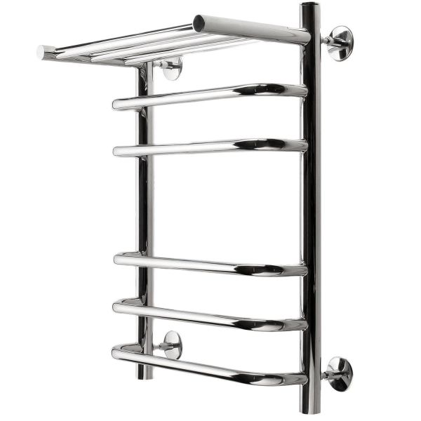 Тщательная полировка изделия придает ей великолепный оттенок «хром». Полотенцесушитель с полкой водяной удобен в использовании, на полочке можно хранить текстильные изделия для просушки, обеспечат круглосуточно теплые полотенца.