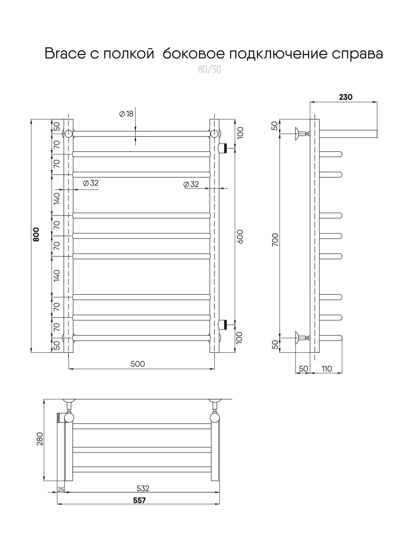 Полотенцесушитель водяной INDIGO Brace с полкой со скобообразными перекладинами и боковым подключением, выполнен в цвете «Черный Муар». Полотенцесушитель с полками одна из самых популярных моделей, так как она позволяет дополнительно разместить на изделии полотенца и халаты.