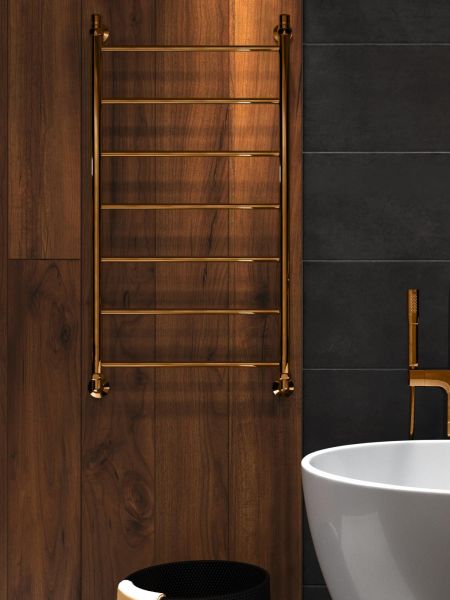 Водяной полотенцесушитель серии «Лесенка» Line золотого оттенка с безупречным блеском. Простой, но стильный, изготовлен из высококачественной нержавеющей стали. Идеально сочетается с золотой сантехникой или интерьером в классическом стиле.