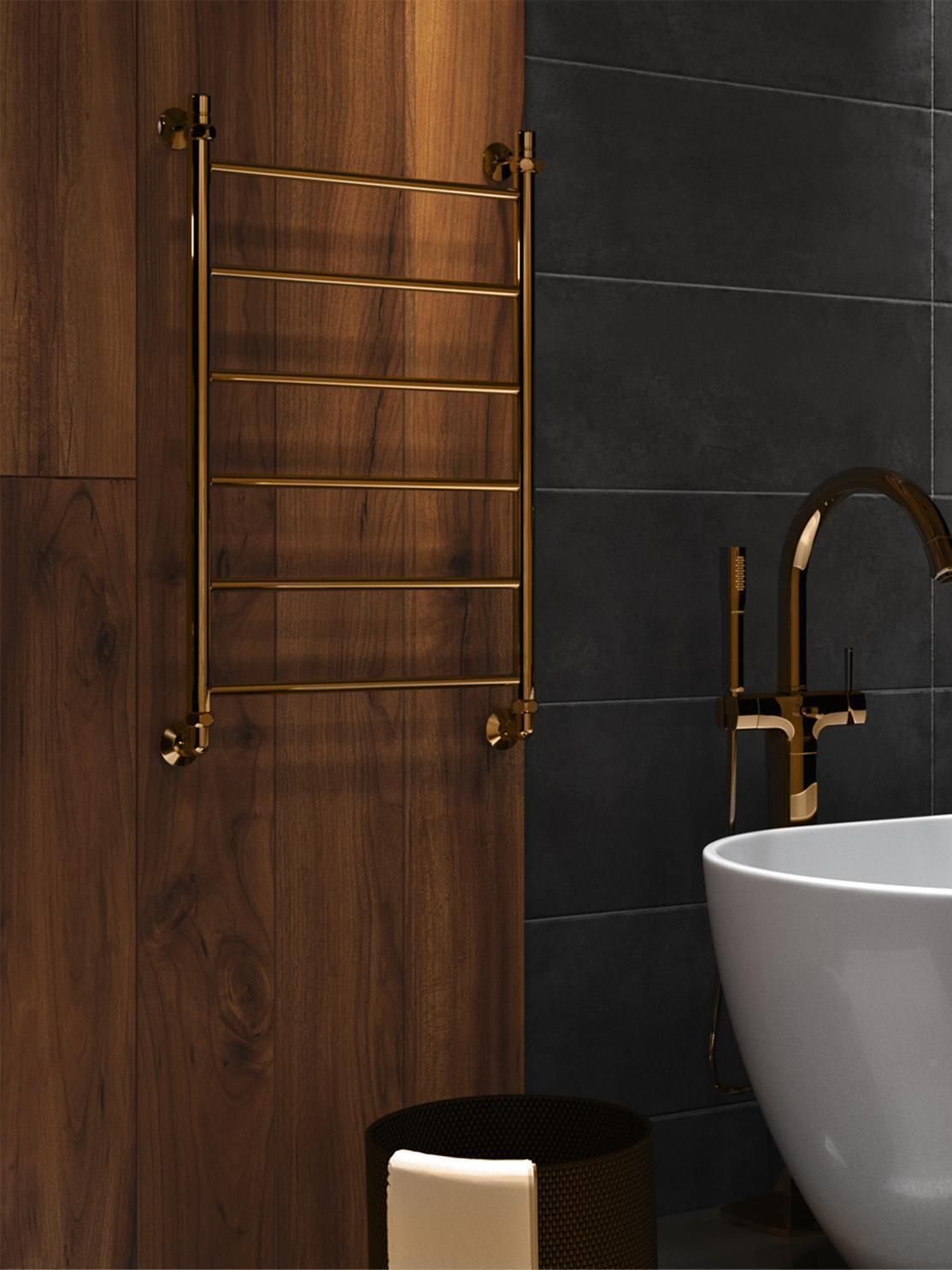 Водяной полотенцесушитель серии «Лесенка» Line золотого оттенка с безупречным блеском. Простой, но стильный, изготовлен из высококачественной нержавеющей стали. Идеально сочетается с золотой сантехникой или интерьером в классическом стиле.