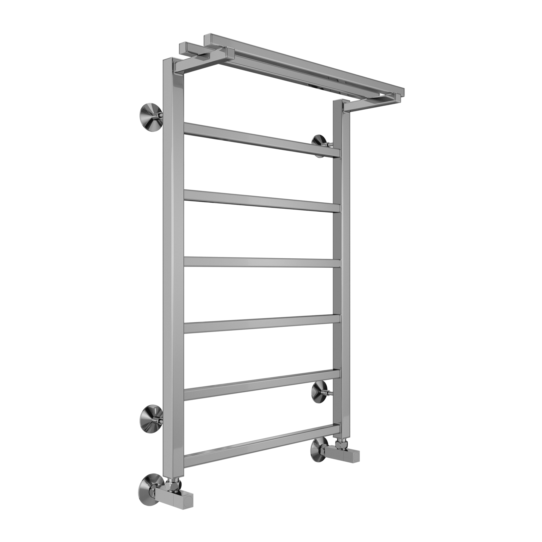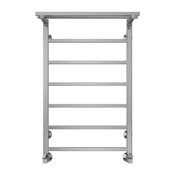 Модель "Контур с полкой" относится к линейке в стиле хай-тек, тяготеющей к лаконичным формам и хромированным поверхностям, и отличается наличием дополнительной прогреваемой полки для хранения и сушки полотенец.