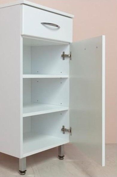 Оптимальная высота пенала позволяет использовать его поверхность как дополнительную столешницу, небольшой удобный ящик с направляющими полного выдвижения подойдет для хранения мелких аксессуаров, а распашная дверца скрывает вместительное внутреннее пространство с двумя регулируемыми по высоте полочками, на которой можно компактно разместить бытовые принадлежности.