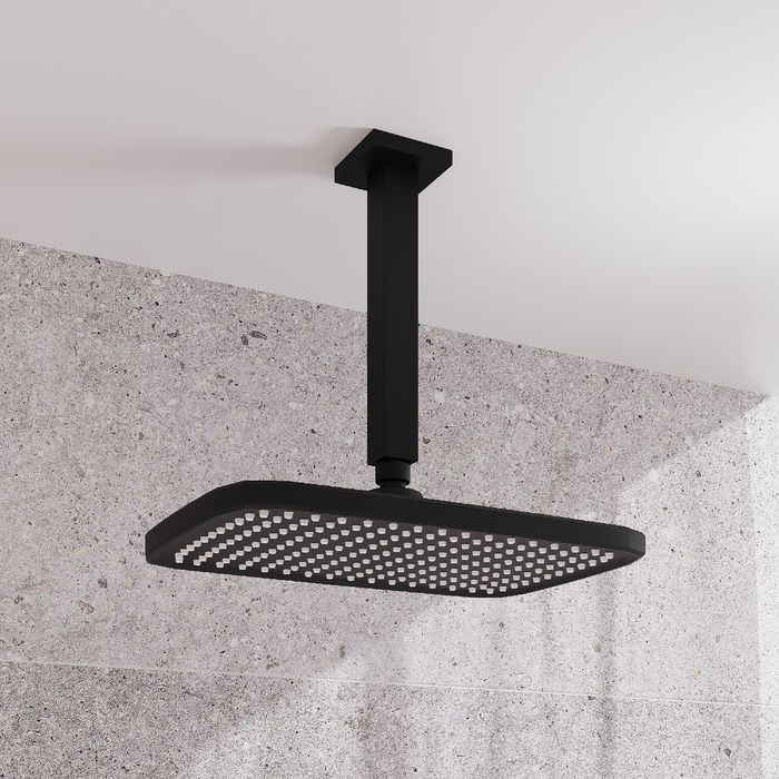Черный матовый потолочный кронштейн для верхней душевой лейки. Квадратные формы, длина 200 мм. Надежно зафиксирует лейку в необходимом положении, позволяя насладиться тропическим душем. Место крепления кронштейна скрыто квадратным декоративным отражателем, что обеспечивает привлекательный внешний вид всей конструкции.