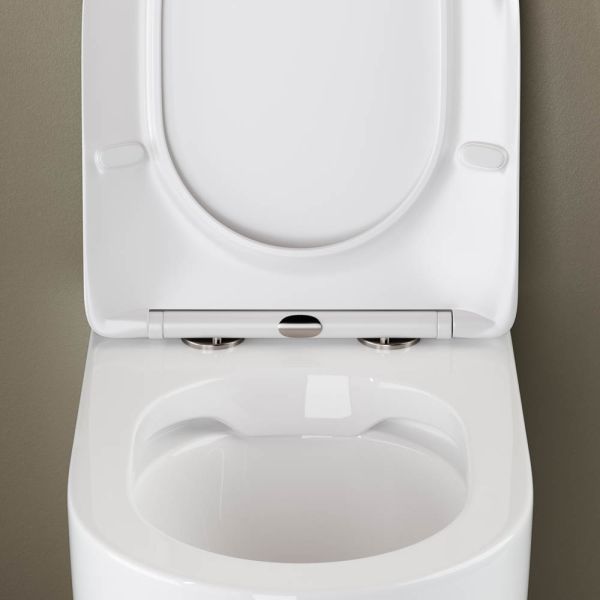Напольный пристенный унитаз-соло HighLight Rimless, глубокий смыв, горизонтальный (универсальный) выпуск, с крепежом, ультра тонким сидением с функцией плавного закрытия, дюропласт