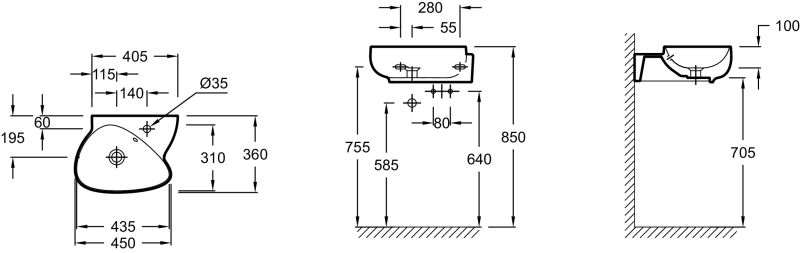 РАЗМЕТКА СВЕРЛЕНИЯ ОТВЕРСТИЯ ДЛЯ СМЕСИТЕЛЯ: 1 сквозное отверстие
