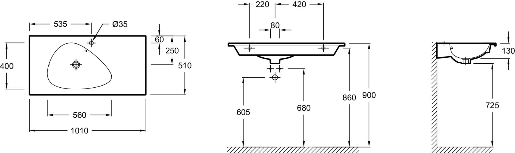 РАЗМЕТКА СВЕРЛЕНИЯ ОТВЕРСТИЯ ДЛЯ СМЕСИТЕЛЯ: 1 сквозное отверстие