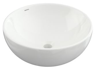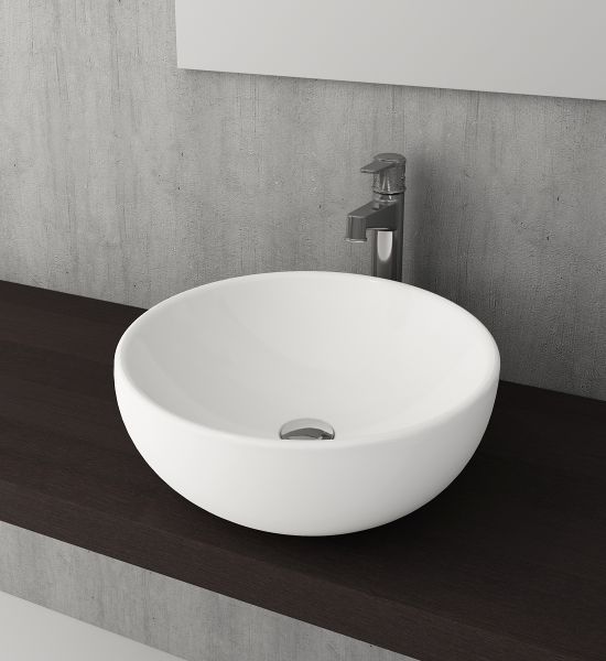Накладная раковина из санфарфора Berges Mascon диаметром 45 см. Высота 17,5 см. Круглой формы, без отверстия под смеситель, глянцевая белая.