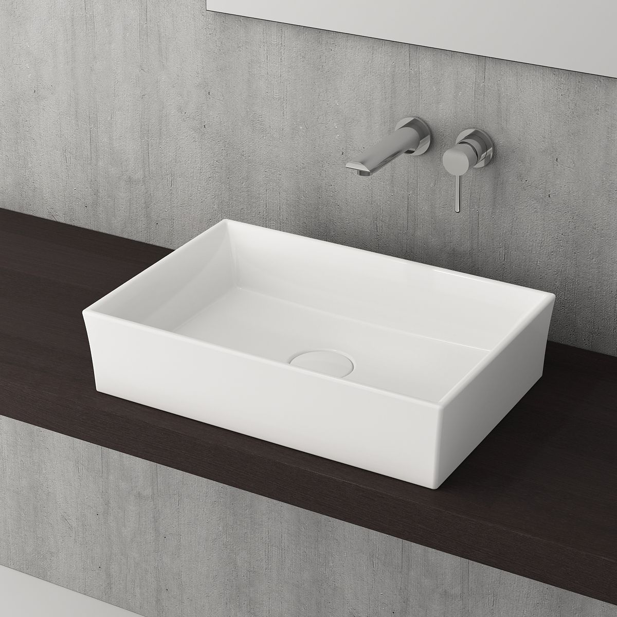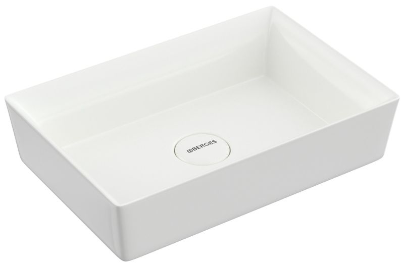 Накладная раковина из санфарфора Berges Mascon размером 58х38х12,5 см.Прямоугольной формы, без отверстия под смеситель, глянцевая белая.Керамическая крышка слива в комплекте.